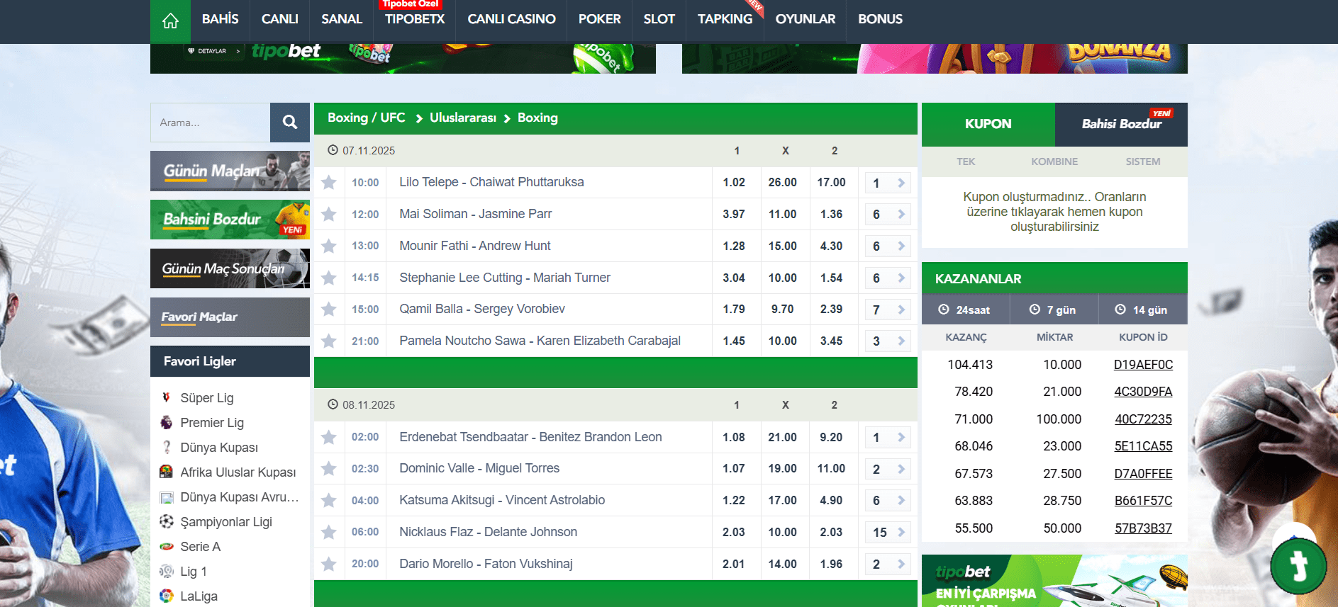 Boks, gücü ve zekâyı aynı anda sergileyen özel bir spordur. Her raund, heyecan ve stratejinin iç içe geçtiği bir mücadeleyi temsil etmektedir. Tipobet, bu mücadeleyi kazanca dönüştürmek isteyen kullanıcılar için boks bahislerinde yüksek oranlar ve avantajlı seçenekler sunmaktadır.