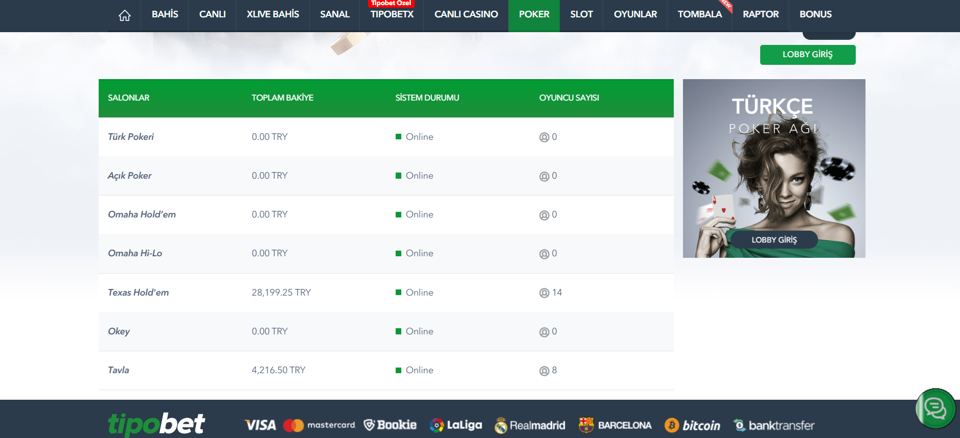 Kayıt sonrası giriş yaptıktan sonra poker bölümüne geçiş yaparsın. Masa seçimini dilediğin gibi yapabilir, ister düşük limitli ister yüksek bahisli masalara oturabilirsin.